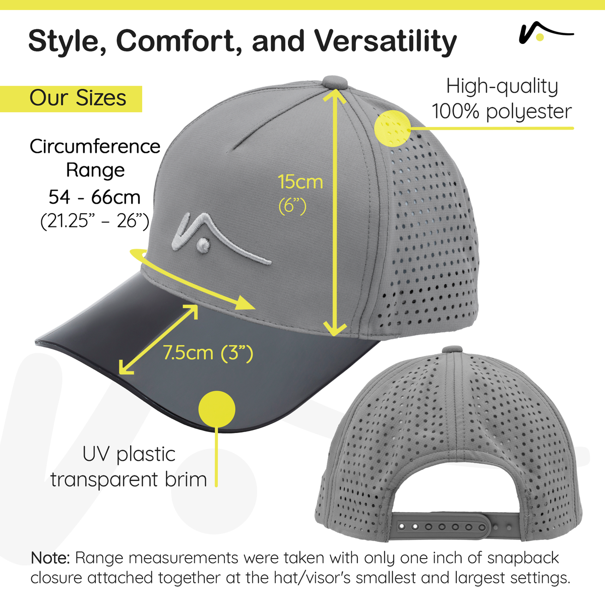 For those who enjoy outdoor sports, our hats and visors stand out as the superior choice over traditional hats and visors with cotton brims.  The key lies within the transparent UV brim, a game-changing feature that traditional headwear lacks.  Instead of limiting view, our hats offer unparalleled 360-degree views, enhancing depth perception and situational awareness in a way that conventional brimmed hats and sunglasses simply can’t.
