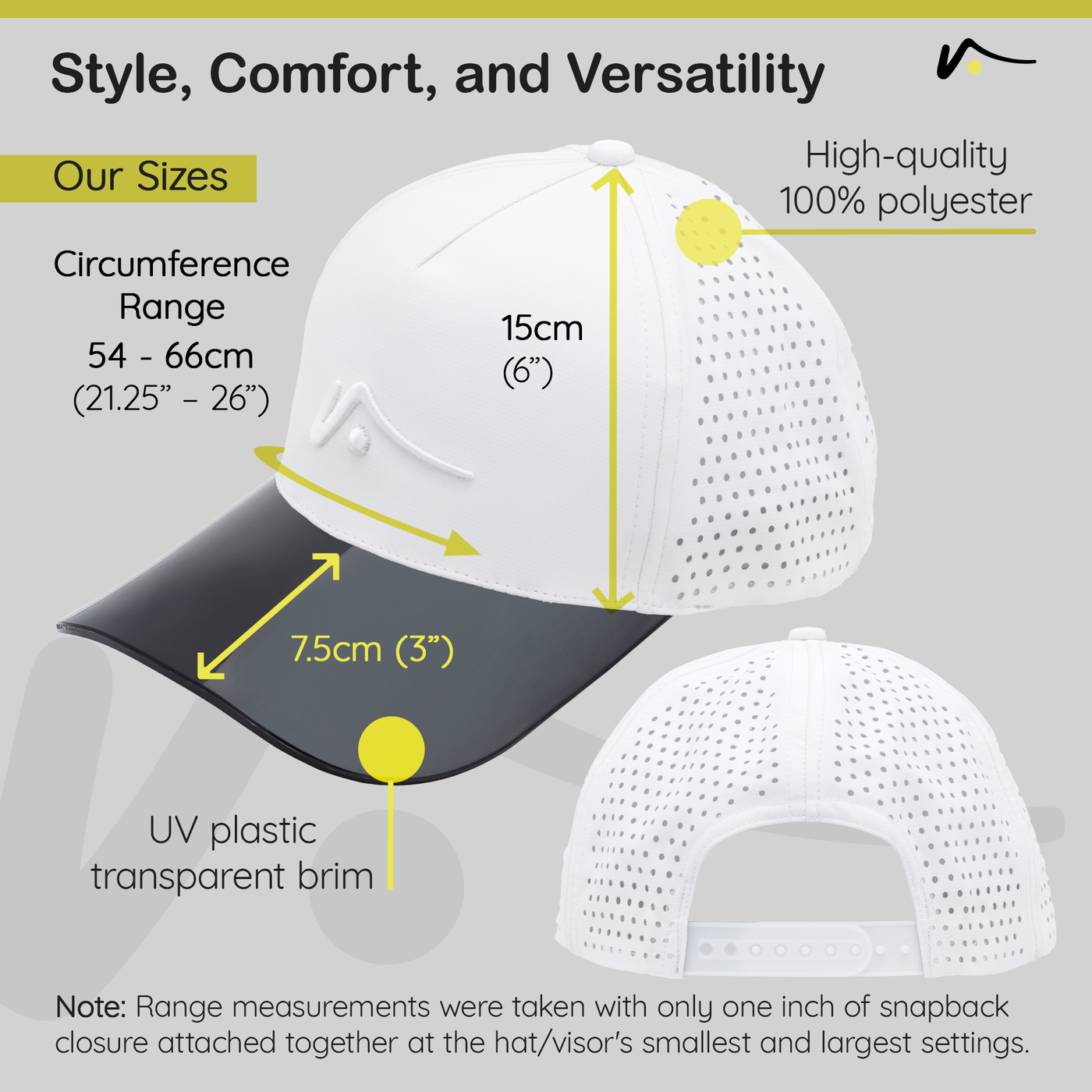 For those who enjoy outdoor sports, our hats and visors stand out as the superior choice over traditional hats and visors with cotton brims.  The key lies within the transparent UV brim, a game-changing feature that traditional headwear lacks.  Instead of limiting view, our hats offer unparalleled 360-degree views, enhancing depth perception and situational awareness in a way that conventional brimmed hats and sunglasses simply can’t.